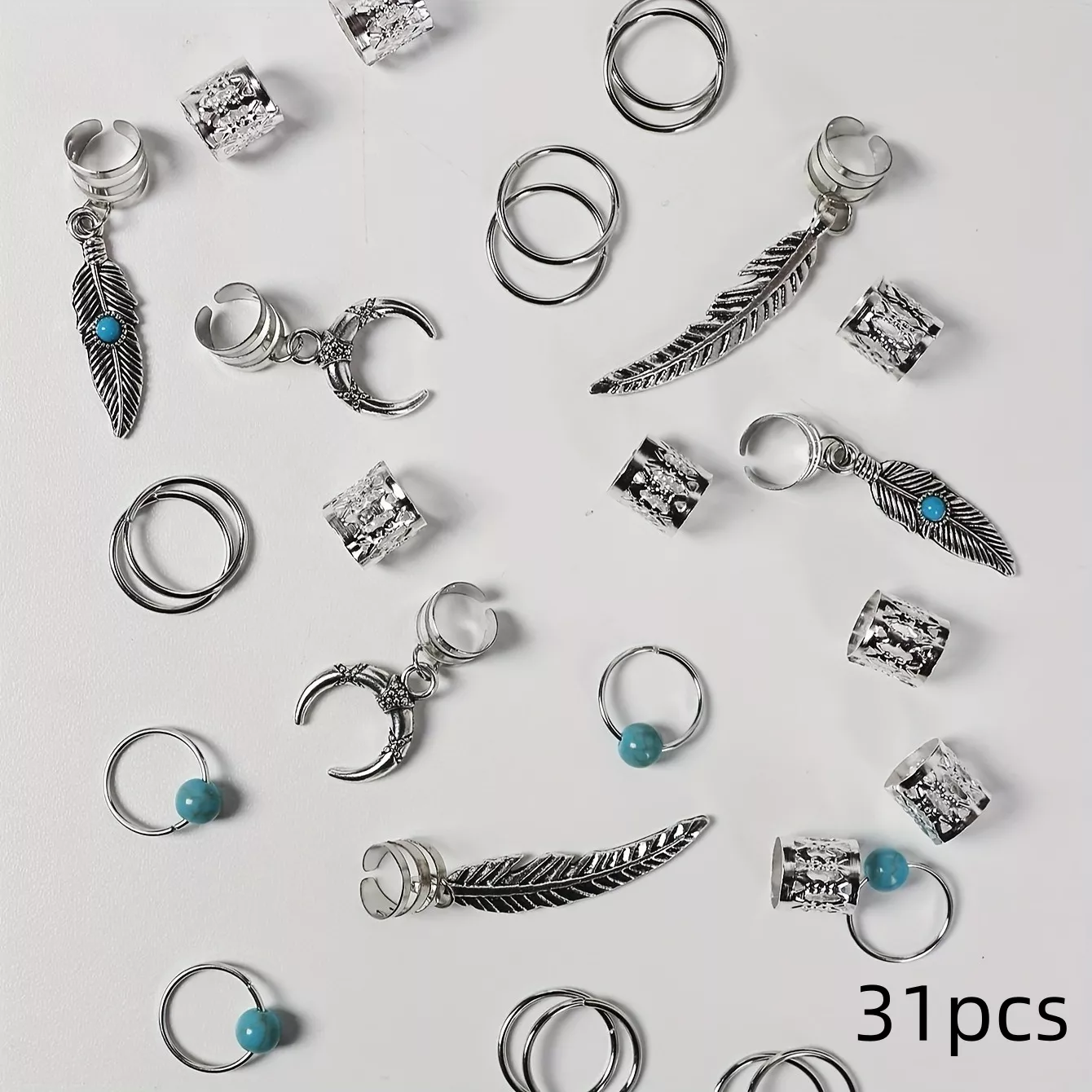Give your braids a stunning bohemian makeover with this 31-piece turquoise dreadlock beads and rings set. Designed to celebrate your unique style, these metal hair accessories bring out the best in your locs, twists, and braids. Each piece features vibrant turquoise pendants and intricate patterns that add a touch of hippie charm to your hair in seconds.
